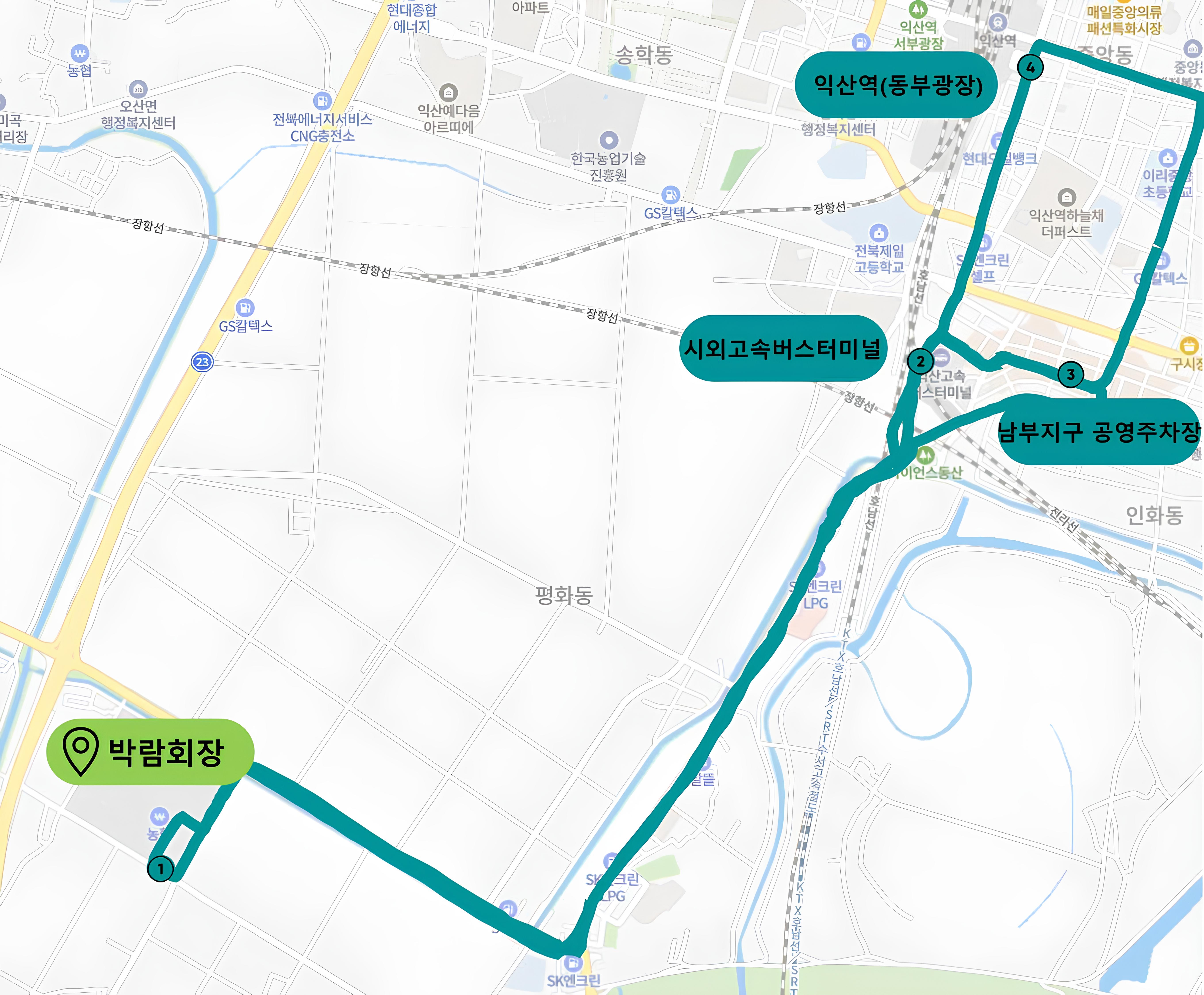 ①박람회장 → ②시외고속버스터미널 → ③남부지구 공영주차장 → ④익산역 → ② 시외고속버스터미널 → ③남부지구 공영주차장 → ①박람회장