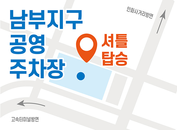 시외고속버스터미널 주차장 쪽 안내 부스에서 안내를 받고 이동하세요.